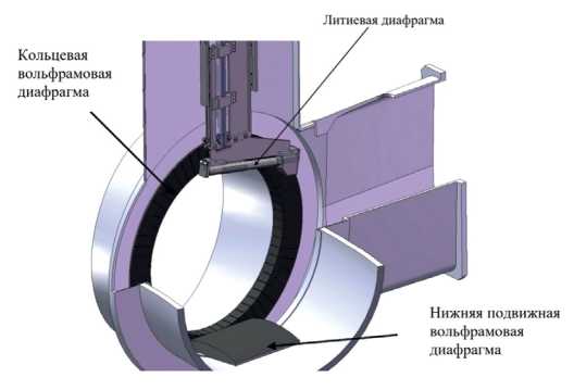 Схема расположения вольфрамовых и литиевой диафрагм в камере Т-10 схематически показана на рис. 8. Черным цветом обозначены рельсовая (внизу) и круговая вольфрамовые диафрагмы. Они были изготовлены в НИИЭФА им. Ефремова. Использовался вольфрам марки “Полема”. Радиус круговой и рельсовой диафрагм составлял 33 и 30 см соответственно.