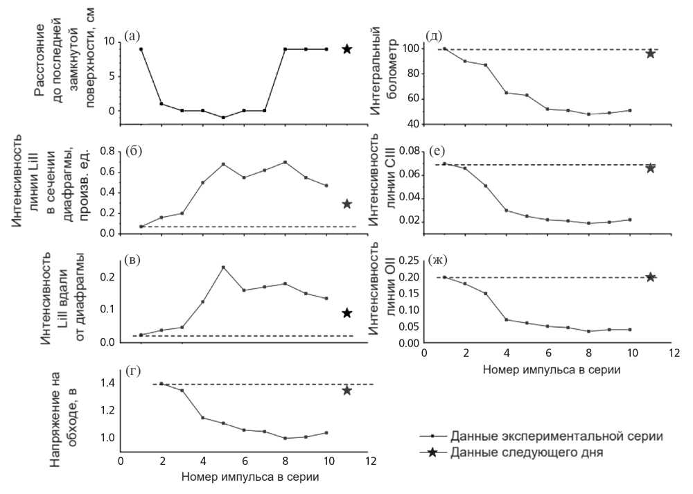Данные рис. 7 показывают высокую корреляцию изменения таких интегральных характеристик разряда как напряжение обхода и радиационные потери с потоками примесей с диафрагмы, в то время как поток углерода вдали от диафрагмы меняется мало и постепенно. Это говорит о том, что основное поступление примесей происходит с диафрагмы и распыление лития в этой области эффективно снижает уровень примесей в разряде. Необходимо также отметить, что проведение тлеющего разряда в гелии не приводит к восстановлению сорбционных свойств лития.