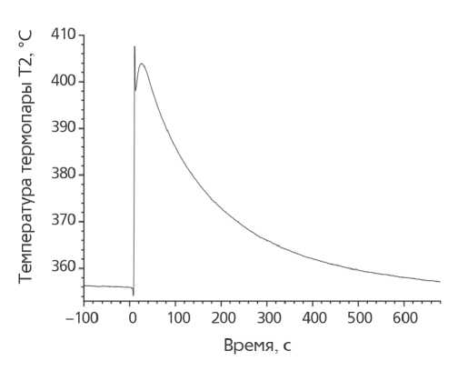 На рис. 2 приведено сравнение временного хода температуры в процессе охлаждения элемента до начала серии экспериментов и после 5 процессов напыления. Видно, что длительность плато температуры, соответствующая времени фазового перехода лития из жидкого в твердое состояние сократилось на 71 с. Поскольку было известно, что первоначально было заправлено 16 г лития, то потеря массы лития за одну литиизацию оценивалась по относительному сокращению длительности плато температуры как δm = 16/5(226—155) / 226 = 1 г.