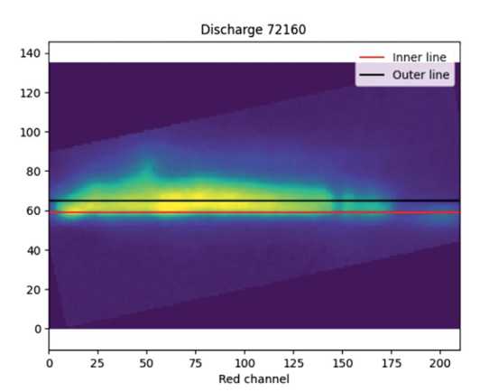 Приведены три кадра. Левый — в начале серии (67887), средний — в середине (67910) и правый — в конце экспериментов (67952). Красный цвет соответствует свечению линий Dα 6561 Å и LiI 6105 Å. Зеленый — свечению линии 5485 Å LiII. Все кадры сняты с одинаковой экспозицией. На на верхней области кадров располагалась литиевая диафрагма на радиусе 32 см. В нижней области располагалась вольфрамовая рельсовая диафрагма на радиусе 30 см.