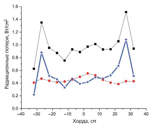 На рис. 36 приведены профили хордовых сигналов пироэлектрических болометров и полупроводниковых датчиков AXUV для разряда с доминированием лития. Видно, сигналы AXUV мало меняются по хордам, в то время как сигналы болометра скинированы.