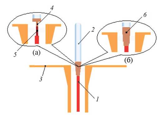 Рис. 1. Плазменная несимметричная вибраторная антенна с питанием от коаксиального кабеля: через электрод газоразрядной трубки (a), через коаксиальный соединитель (б): 1 — металлический экран, 2 — газоразрядная трубка, 3 — коаксиальный кабель, 4 — электрод газоразрядной трубки, 5 — соединительный провод, 6 — коаксиальный соединитель.