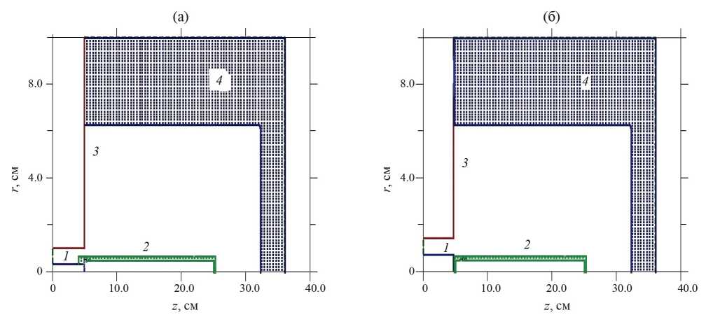 Рис. 3. Схемы численных моделей плазменной вибраторной антенны: соединение через электроды (а), соединение через коаксиальный соединитель (б): 1 — коаксиальный кабель, 2 — диэлектрическая трубка с PIC плазмой, 3 — металлический экран, 4 — универсальный поглощающий слой PML.