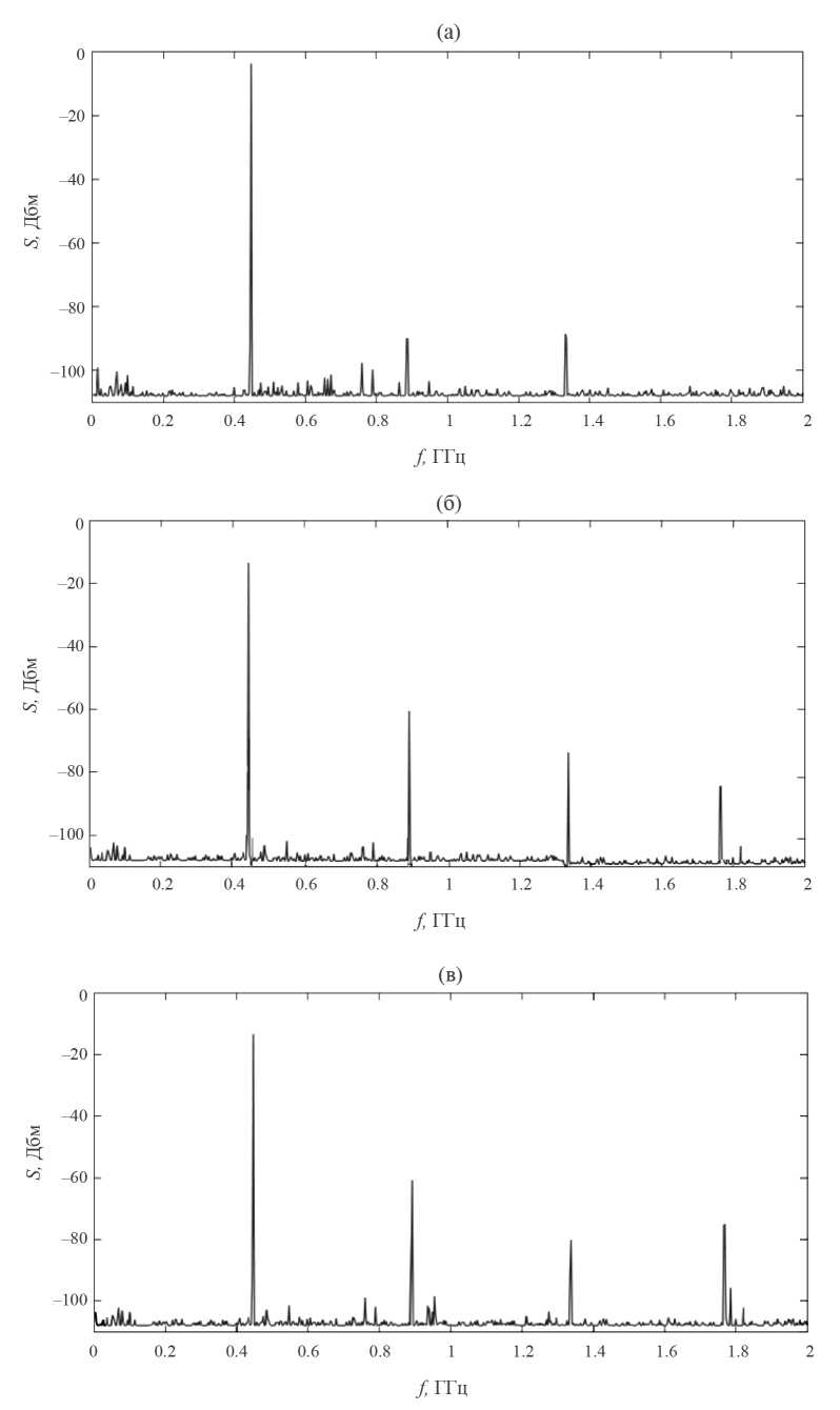 Как уже указывалось выше, источник входного сигнала был немоногармонический и в спектре входного сигнала наблюдались паразитные частоты (кратные основной частоте) сравнительно малой амплитуды. Это паразитные частоты проявляются и в спектре излучения МНВА (рис. 4а). В спектре ПНВА (рис. 4б, в) также присутствуют эти кратные гармоники с увеличенной амплитудой по сравнению с МНВА. В моделировании использовался моногармонический внешний сигнал. Тем не менее в спектрах на рис. 5 наблюдаются кратные гармоники (лучше разрешена и заметна вторая гармоника). Структура спектра зависит от способа возбуждения ПНВА.
