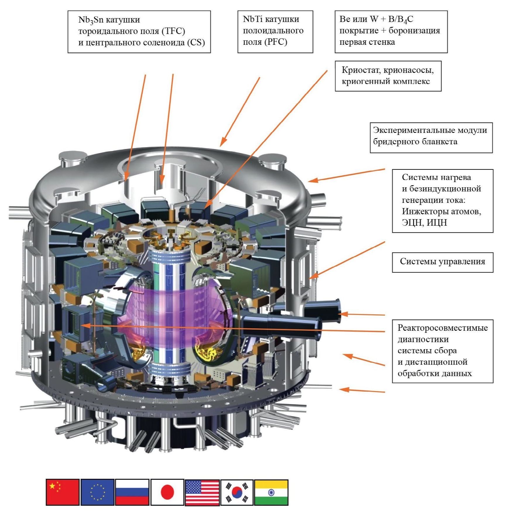 В рамках проекта ИТЭР на базе достижений развития токамаков в Советском Союзе, США (TFTR) и ЕС (JET), а также в Японии (JT-60U), Китае (EAST) и Республике Корея (K-STAR) создаётся технологическая платформа термоядерного реактора [1] и уже сегодня начинает формироваться мировая термоядерная промышленность. Технологическая платформа ИТЭР (см. рис. 1) включает электромагнитную систему (ЭМС) из низкотемпературных сверхпроводников (катушки тороидального поля (TFC) и центрального соленоида (CS) — из Nb3Sn, катушки полоидального поля (PFC) — из NbTi), первую стенку из Ве (в настоящее время также рассматривается вариант создания первой стенки из W + В покрытия (боронизация тлеющим разрядом и непосредственно в разряде ИТЭР с вводом крупинок бора)), W-дивертор c напуском Ne, криостат, крионасосы, криогенный комплекс, системы дополнительного нагрева и неиндуктивной генерацией тока, реакторосовместимые диагностики, системы сбора и дистанционной обработки данных, системы управления, экспериментальные модули бридерного бланкета и другие системы и технологии, уровень разработки которых и определяет современный мировой уровень технологического развития.