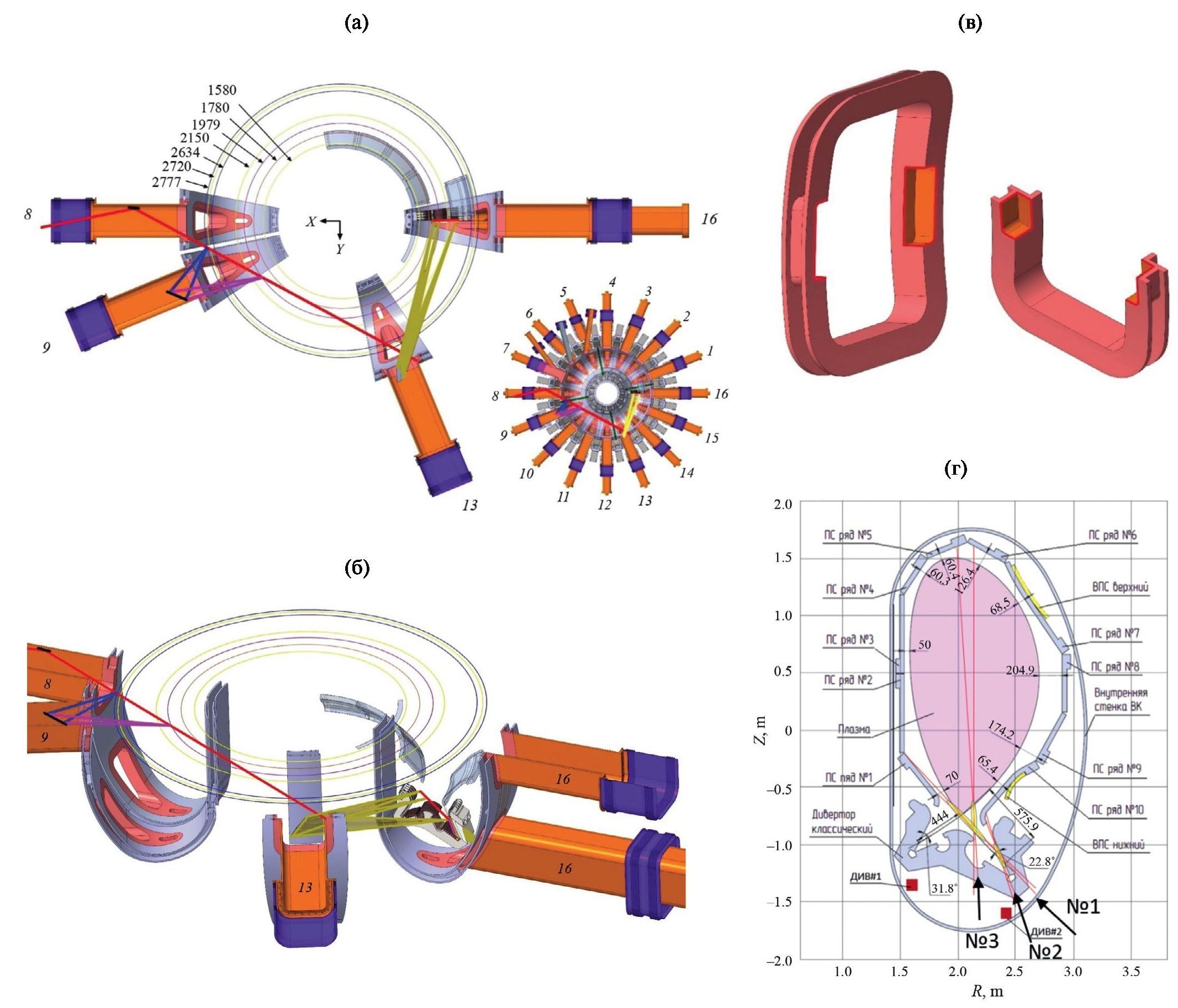 Рис. 1. Расположение схем зондирования систем томсоновского рассеяния токамака ТРТ: схемы проведения лазерного пучка из патрубка 8 в патрубок 13 и сбора излучения через патрубок 9, а также лучи системы сбора из патрубка 13 для хорды 1 диверторного патрубка 16 (вид сверху) (а). Цифры соответствуют большому радиусу токамака: 2777 мм = r + 1.1a (r/a=1.1); 2720 мм = r + a (r/a = 1); 2634 мм = r + 0.85a (r /a = 0.85); 1979 мм = r — 0,3a (r/a = –0.3); тоже в 3-мерной геометрии (б); вырезы на выходе в экваториальных патрубков 8, 9 и 13, обведены красными линиями (в); хорды зондирования в полоидальной плоскости диверторного патрубка 16 (г).