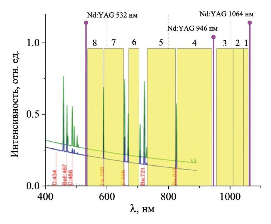 Рис. 2. Конфигурация спектральных каналов фильтрового полихроматора для диагностики центральной и краевой плазмы в сравнении со спектром тормозного и линейчатого фонового излучения плазмы, рассчитанного в коде Cherab командой томсоновского рассеяния центральной плазмы (CPTS) ИТЭР [16]. Расчет выполнен для первого зеркала системы сбора CPTS при использовании первой стенки из бериллия.