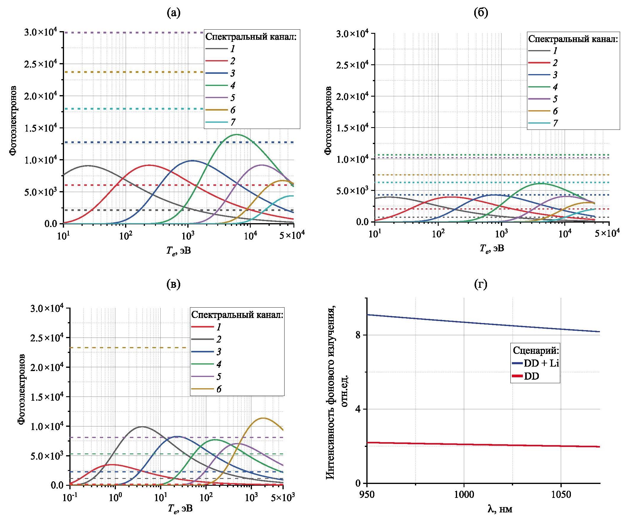 На рис. 4 представлено сравнение сигналов рассеяния в спектральных каналах, рассчитанных для центральной и периферийной систем, в сравнении с уровнем фона в зависимости от локальной температуры плазмы.