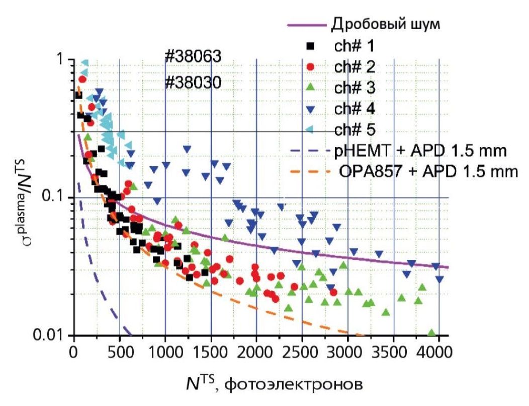 Применяемый сегодня вариант фильтрового полихроматора имеет высоту 2U использует интерференционные фильтры диаметром 1,25ʺ и может иметь до 7 спектральных каналов, что позволяет расположить 15 таких приборов в стандартной 19ʺ стойке. Подобный подход потребует только для диагностики томсоновского рассеяния использовать 20 стоек. Сейчас в стадии разработки находится конструкция фильтрового полихроматора, который при сохранении светосилы прибора, уже зарекомендовавшего себя при работе на отечественных токамаках, позволит перейти на интерференционные фильтры диаметром 1ʺ. Более компактные размеры оптики, применяемой в таком приборе, позволят расположить в одном корпусе высотой 1U два 4-х канальных фильтровых полихроматора. Такие полихроматоры, при сохранении точности измерения температуры, будут иметь на порядок более узкий диапазон измеряемых температур. Однако предполагается, что обеспечиваемый ими диапазон измеряемых температур ~100, закроет большую часть экспериментальных потребностей. Такой подход позволит пятью стойками обеспечить спектральной аппаратурой 300 пространственных точек. Выбор лазеров с длинами волн 1064, 1047 и 946 нм, которые были разработаны в рамках работ по проекту ИТЭР определяет выбор детекторов на основе кремниевых лавинных фотодиодов (ЛФД). Разработанные полихроматоры [23, 24] оснащены сверхмалошумящей (σ ~ 7 фотоэлектронов приведенных ко входу) и высокоскоростной системой детектирования. Опыт работы на токамаке “Глобус-М2” показал, что такие низкие шумы востребованы далеко не всегда. Точность измерения определяется дробовым шумом самого сигнала, дробовым шумом плазменного фона и шумом усилителя и АЦП. На рис. 8 показан вклад плазменного шума в относительные погрешности измеряемого сигнала, полученные при работе в диагностике томсоновского рассеяния центральной плазмы токамака “Глобус-М2”. Видно, что достигнутый сверхнизкий шум усилителя на основе транзистора pHEMT (Pseudomorphic High-Electron-Mobility-Transistor) оказался значительно ниже шума, определяемого фоновым светом плазменного разряда.