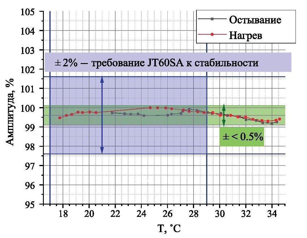Ожидается, что такая конструкция “все в одном” с оптоволоконным входом и цифровым оптическим выходом будет гораздо более устойчивой к электромагнитным помехам. Система сбора данных способна работать с лазерными импульсами длительностью несколько нс. Система сбора данных на базе чипа DRS4 [28] обеспечивает 14-битную оцифровку (11.5 бит с учетом шумов) с амплитудным разрешением ~0.5 мВ и возможностью переключения частоты дискретизации от 1 до 5 ГГц. Такая высокая частота дискретизации в сочетании с осциллографическим режимом работы обеспечивает гибкую обработку цифровых сигналов в отличие от аналоговых методов, чувствительных к заряду. Эта функция открывает новые возможности для проектирования диагностики ТР в современных/будущих термоядерных устройствах, которые включают в себя: работу при высокой фоновой освещенности, измерение очень низкой температуры и концентрации электронов на границе плазмы и SOL, возможность временной отстройки от паразитно рассеянного лазерного излучения, задержанного относительно сигнала ТР. Анализ формы регистрируемого сигнала также дает возможность выделить разнесенное во времени сигналы ТР и рассеяние на пылевых частицах, что важно для измерений в SOL. Испытания на токамаке “Глобус-М2” разработанных для томсоновского рассеяния дивертора ИТЭР прототипов лазеров и полихроматоров, показали отличные характеристики устройств [23]. Продемонстрированно, что один из источников ошибок — тепловой дрейф коэффициента усиления ЛФД, может быть скомпенсирован до уровня ±0.5%, в диапазоне температур окружающей среды от 17.5 до 35 °C [24] (см рис. 10).