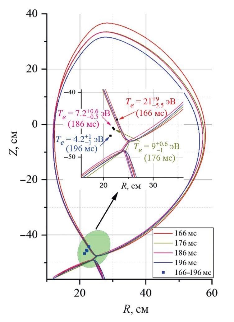 Задачи ТР в диверторной плазме [12] разделяются на изменение параметров плазмы вдоль сепаратрисы на входе в дивертор и в районе Х-точки; вдоль поверхности наружной диверторной пластины в районе strike-point, а также ниже сепаратрисы в области private flux region. Эти данные необходимы для определения скорости реакций с участием электронной компоненты — ионизация, рекомбинация и излучение примеси, которые играют важную роль в охлаждении и рекомбинации плазмы. Эта информация необходима при оптимизации режима работы дивертора по снижению нагрузки на диверторные пластины. Ослабление нагрузки может достигаться при поддержании повышенного давления нейтрального компонента в диверторной области камеры, например, путем подачи в диверторную плазму примесных газов (неон, азот или аргон). В этом случае мощность, поступающая в дивертор из центральной плазмы, достигает поверхности диверторных пластин преимущественно в форме излучения и энергии нейтральных частиц. При нейтрализации плазмы из энергии передаваемой диверторным пластинам ионной компонентой уходит вклад потенциала ионизации атома водорода (13.6 эВ). Вдобавок, нейтральные частицы не удерживаются магнитным полем и поэтому связанный с ними поток энергии распределяется по поверхности первой стенки более равномерно. Такой режим “отрыва” плазмы от диверторных пластин необходимо оптимизировать таким образом, чтобы скорость и место напуска излучающей примеси приводило к переизлучению бόльшей части мощности вне зоны удержания. На сегодняшний день теоретические модели пристеночной и диверторной плазмы, а также режима “отрыва” плазмы от диверторных пластин окончательно не разработаны. Исследования плазмы в области дивертора активно ведутся на всех ведущих токамаках. Наиболее интересные результаты получены диагностиками томсоновского рассеяния дивертора на токамаках ASDEX-U [13], DIII-D [14] и МАST-U [15]. Эти данные требуются как для подтверждения моделей и расчетов численными кодами, так и для определения преимущественных физических процессов в пристеночной плазме.
