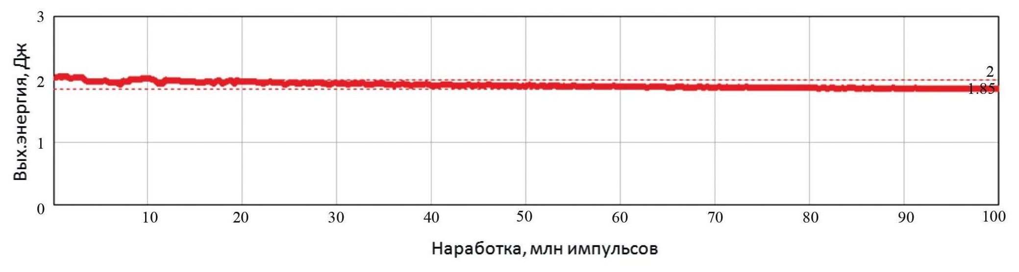 Принципиально важной характеристикой лазерных систем, разрабатываемых для купных токамаков с большой длительностью плазменного импульса, является устойчивость рабочих характеристик со временем. Это позволит использовать диагностику томсоновского рассеяния не только для надежного мониторинга плазменных параметров, но и применение в управлении токамаком при включении ТР в обратную связь. Один из разработанных лазеров Nd: YLF с длиной волны 1047 нм был протестирован при выработке 100 миллионов импульсов, что соответствует непрерывной работе лазера в течение ~567 ч. В ходе испытаний лазер продемонстрировал отличную 24-часовую стабильность энергии импульса со среднеквадратичным значением ~1%. За время испытаний энергия выходного импульса снизилась на ~9% с 2.0 до 1.85 Дж. Постепенное снижение энергии в основном было связано с медленной деградацией лазерных диодных матриц в одном из усилительных каскадов лазера (см. рис. 12).