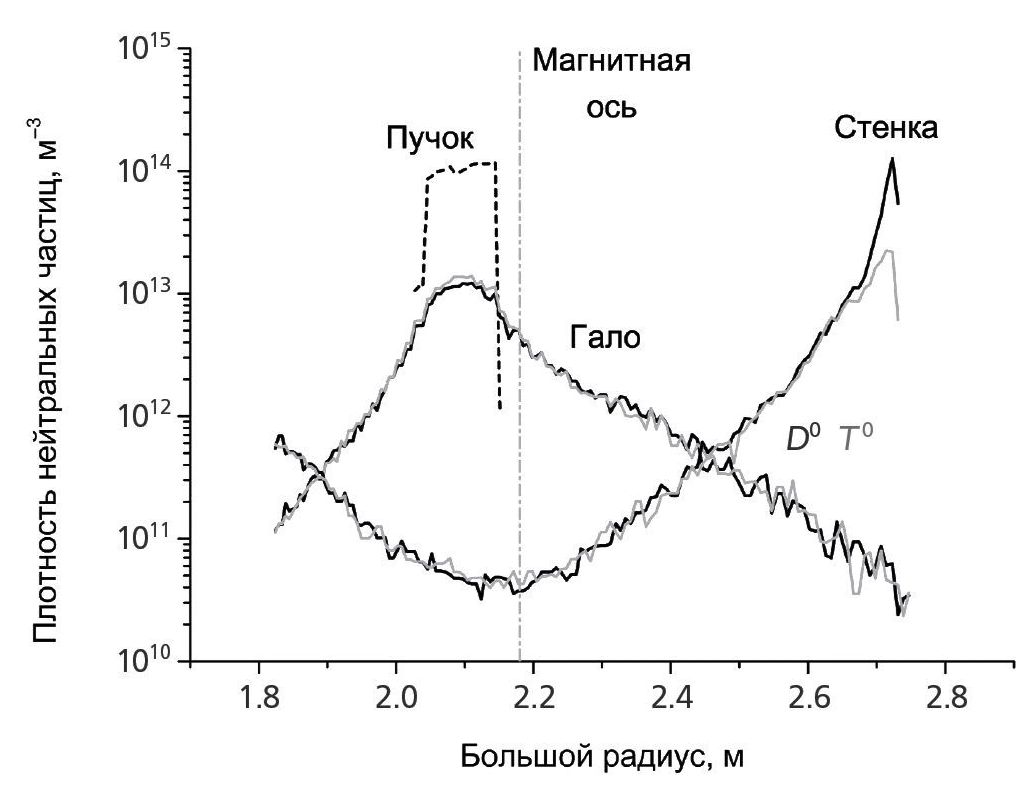 Моделирование процессов нейтрализации ионов и расчеты потоков выходящих атомов проводились с помощью плазмофизического кода DOUBLE-MC [3]. На первом этапе моделирования был сделан расчет пространственного распределения атомов-доноров, на которых может происходить нейтрализация ионов плазмы. В качестве примера, на рис. 2 приведено распределение атомов-доноров вдоль центральной линии наблюдения анализатора для случая тангенциальной схемы наблюдения, где указаны основные составляющие, дающие вклад в нейтрализацию ионов тепловых энергий (до 200 кэВ). В первую очередь это атомы, проникающие в плазму из пристеночной области. Они характеризуются высокой плотностью на краю плазмы и быстрым «прогоранием» к ее центру. Также, при инжекции, в плазме будут присутствовать атомы самого пучка. Кроме того, пучок будет генерировать вокруг себя так называемое гало. Это вторичные атомы, образовавшиеся в результате перезарядки ионов плазмы на атомах пучка. Из результатов, представленных на рис. 2, видно, что в центральной зоне плотность атомов самого пучка и его гало (активный сигнал) на порядки выше «естественной» плотности атомов, проникающих в плазму со стенки установки (пассивный сигнал). Поэтому можно предположить, что перезарядка на дополнительных атомах-донорах от пучка и его гало, должны дать заметный вклад в поток атомов из центральной зоны плазмы. При этом следует учитывать, что хотя плотность гало на порядок ниже плотности пучка, нейтрализация ионов на нем может быть сопоставима с нейтрализацией на атомах самого пучка благодаря большей величине сечения перезарядки в области тепловых энергий.
