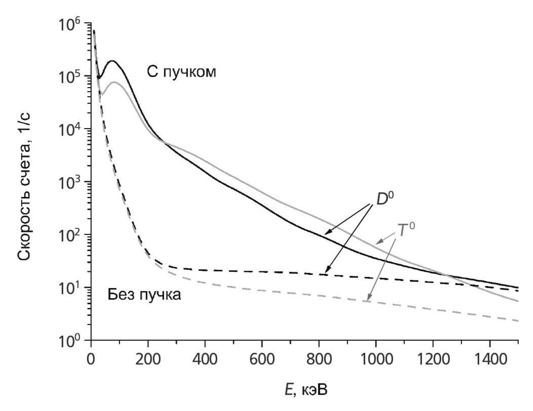 На рис. 6 представлены результаты моделирования скоростей счета нейтрализованных knock-on ионов дейтерия и трития в детекторных каналах анализатора для базового сценария разряда установки ТРТ. В данном случае, в качестве примера, была рассмотрена тангенциальная схема наблюдения. Видно, что в области энергий выше 0.5 МэВ, где нет влияния нагревных пучков на энергетический спектр регистрируемых атомов, уровень активного сигнала может достигать величины ~ 103 Гц. Это обеспечит проведение измерений изотопного соотношения в центре плазмы ТРТ по потоку нейтрализованных knock-on ионов с временным разрешением не хуже 0.1 с.