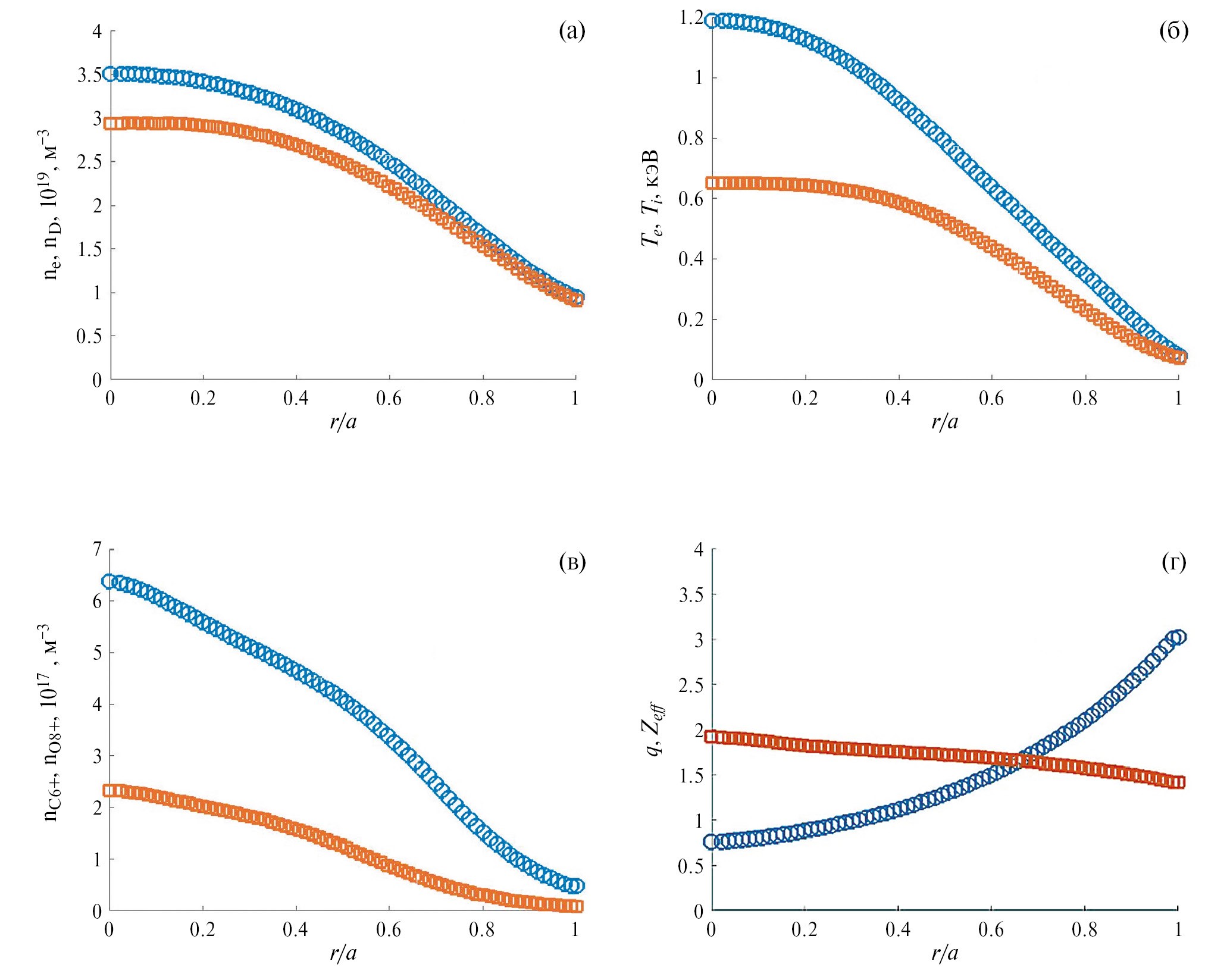 Рис. 1. Радиальные профили разряда 71568, вычисленные с помощью кода ASTRA : a) плотности электронов и дейтронов; б) температуры электронов и ионов; в) плотности ионов углерода и кислорода; г) эффективный заряд плазмы и запас устойчивости.