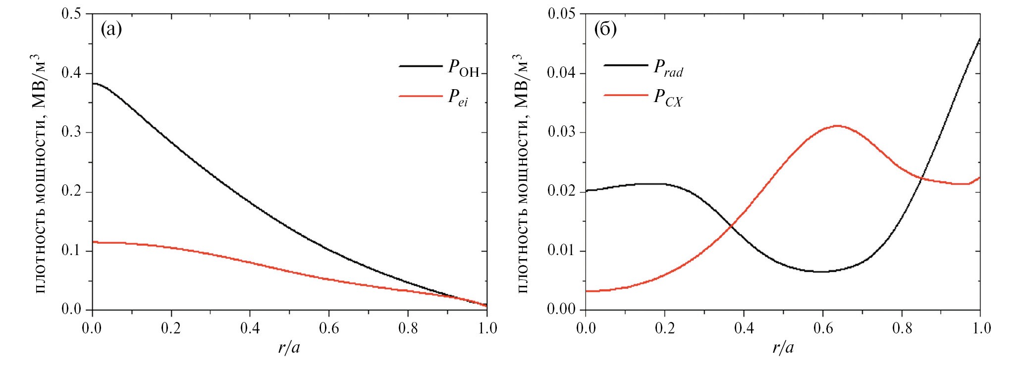 Удельные мощности омического нагрева, кулоновского взаимодействия, радиационных потерь и потерь на перезарядку, рассчитанные с помощью кода ASTRA, показаны на рис. 2. Пикированное на оси значение POH определяется зависимостью Спитцеровской проводимости от температуры электронов. Мощность кулоновского нагрева Pei относительно невелика, что приводит к заметному вкладу в ионный тепловой баланс слагаемого с мощностью перезарядки PCX и высоким значениям отношения Te/Ti.
