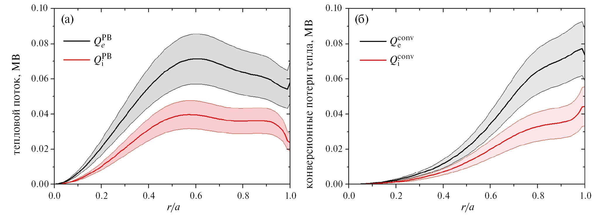 Профили тепловых потоков ионов и электронов, рассчитанные с помощью кода ASTRA из уравнений теплового баланса (1), (2) и отдельно конвективные члены показаны на рис. 3. Значения потоков электронов и ионов с учетом ошибок измерений в 20% показаны соответственно серым и красным цветом. В частности, для среднего радиуса плазмы с r/a = 0.50 тепловые потоки электронов и ионов оказались равными = 68±13 кВт и = 39±8 кВт. Приведенные расчеты потоков с учетом ошибок измерений выполнены с помощью дополнительного транспортного кода для примесей ASTRA/STRAHL [18]. Данные предоставлены командой токамака Т-10 и считаются наиболее точным приближением к экспериментальным результатам.
