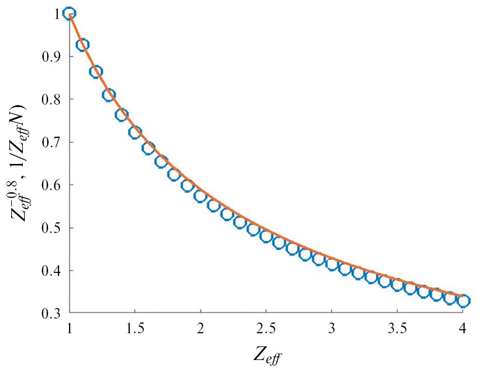 Аналитические приближенные выражения для тепловых потоков частиц необходимы для проверки результатов соответствующих численных расчетов. В этом разделе представлен простой скейлинг и моделирование в коде ASTRA ионного и электронного потока тепла зависимости от эффективного заряда без радиационных потерь (без кода STRAHL). Найдем аналитическую зависимость теплового потока электронов от эффективного заряда Zeff . Неоклассическая зависимость проводимости Спитцера от Zeff [19] (4)