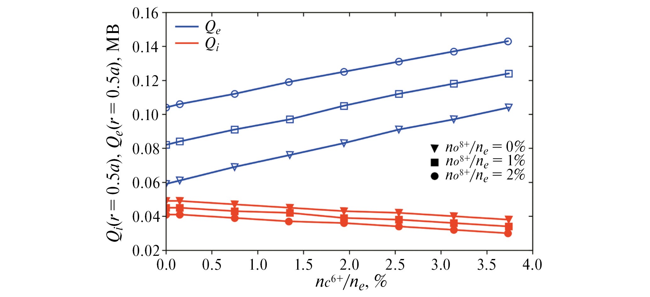 Аналитические зависимости тепловых потоков электронов (13) и ионов (14) от эффективного заряда плазмы в параксиальном приближении без учета эффектов радиационных потерь и процессов перезарядки подтверждаются соответствующими численными расчетов с помощью кода ASTRA. На рис. 5 показаны результаты этих численных расчетов тепловых потоков в зависимости от относительной концентрации ионов углерода и кислорода для параметров разряда T10#71568. На рис. 5 ионный тепловой поток (r/a = 0.5) для среднего радиуса плазмы показан тремя линиями снизу с относительной концентрацией кислорода nO/ne = 0% (треугольники), nO/ne = 1% (квадраты), nO/ne = 2% (кружки). В рассматриваемом диапазоне относительных концентраций углерода nС/ne = [0.0, 3.5]% ионный тепловой поток меняется слабо и приближенно равен (r/a = 0.5) 50 кВт.