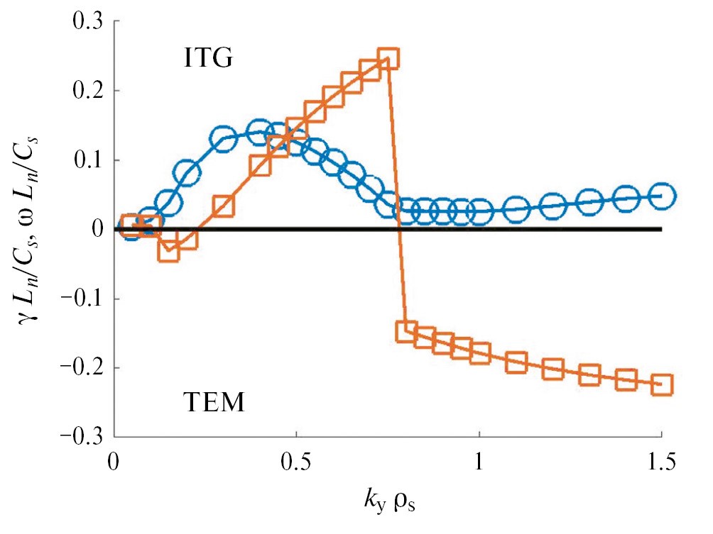 Рис. 7. Нормированный инкремент роста (кружки) и частота (квадраты) как функция волнового числа k y ρ s, рассчитанная с помощью кода GENE в линейном приближении для разряда T 10#71568 с двухкомпонентной моделью при R / L n = 5.0, Z eff = 1.0. Частоты мод ITG положительны, мод ТЕМ – отрицательны.