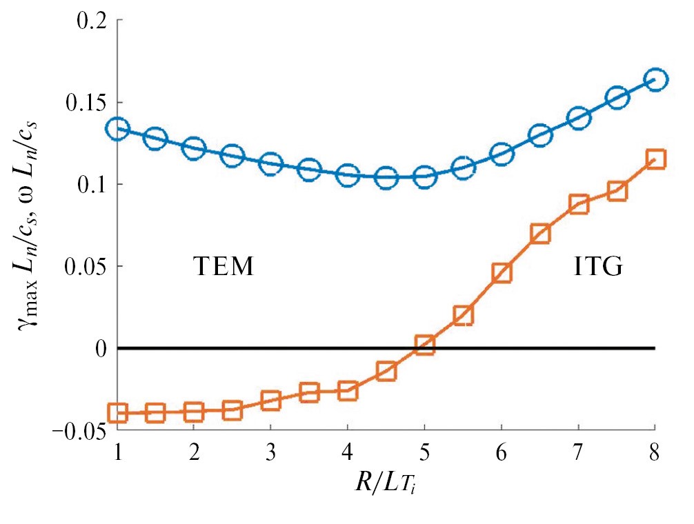 На рис. 8 показаны максимальный инкремент роста и соответствующая частота моды в зависимости от нормированного градиента температуры R/LTi, вычисленные для разряда T10#71568 с помощью кода GENE в линейном приближении для двухкомпонентной модели с эффективным зарядом Zeff = 1.0. В этом случае частота (квадраты) меняет знак вблизи критического градиента ионной температуры R/LTi = 5, в соответствии с приближенным скейлингом LLNL [4]. Большой инкремент роста TEM-моды возникает в области R/LTi < 5, связанный с большим градиентом электронной плотности.