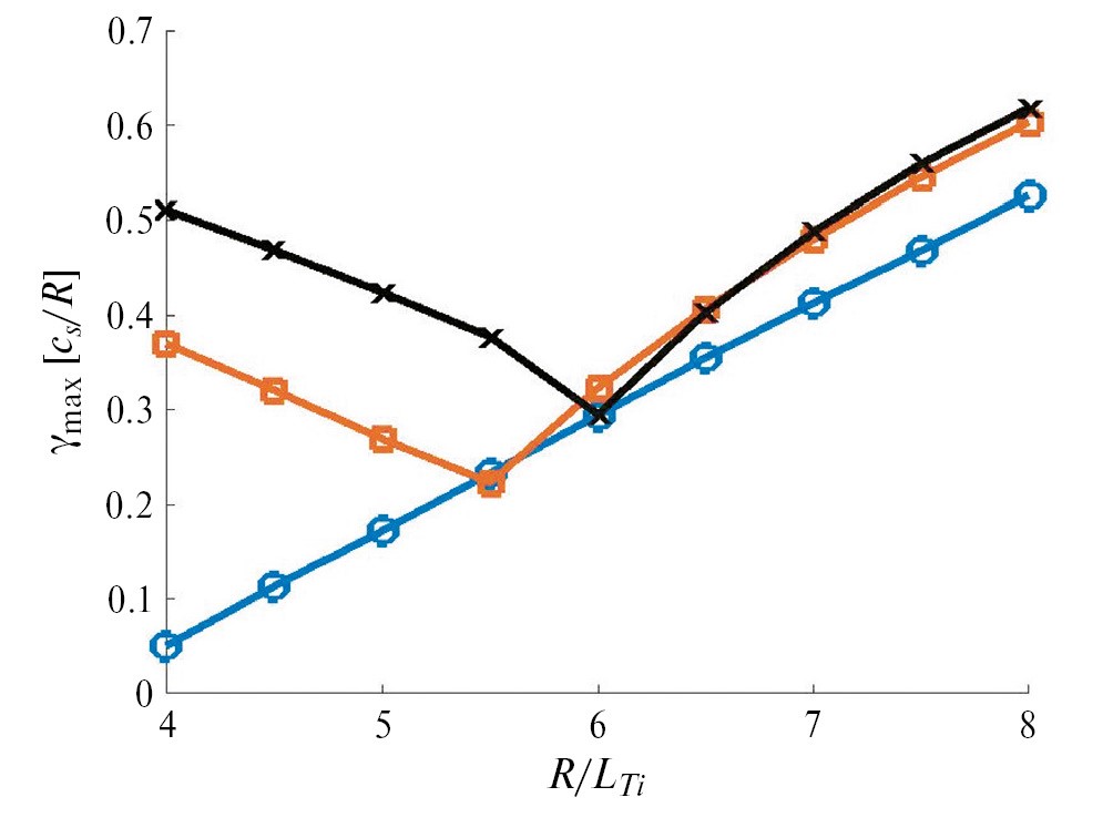 Рис. 9. Максимальный инкремент роста в зависимости от нормированного градиента ионной температуры, рассчитанный с помощью кода GENE для разряда T -10 #71568 с моделью четырехкомпонентной плазмы при Z eff = 1.6, для R / L n = 2.0 (кружки), R / L n = 4.5 (квадраты), R / L n = 5.0 (крестики).
