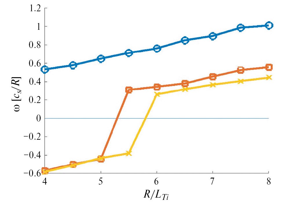 Влияние примесей углерода и кислорода в более сложной четырехчастичной модели плазмы разряда T-10#71568 с эффективным зарядом Zeff = 1.58 представлено на рис. 9 с инкрементом роста и на рис. 10 с соответствующей частотой в зависимости от нормированного градиента температуры R/LTi для различных градиентов плотности: R/Ln = 2.0 (кружки), R/Ln = 4.5 (квадраты), R/Ln = 5.0 (крестики). Результаты расчетов для разряда T10#71568 аналогичны результатам расчетов мод ITG/TEM в токамаке JET, описанным в статье [6]: в случае небольшого градиента плотности R/Ln = 2.0 (кружки) инкремент роста и частота ITG-моды имеют линейные зависимости от градиентов температуры. При большом градиенте плотности –R/Ln = 5.0 ТЕМ мода имеет большой инкремент роста даже при R/LTi = 4. Для разряда T10#71568 наблюдается аналогичное изменение знака частоты TEM-моды, как и в расчетах кода GENE для токамака JET [9].