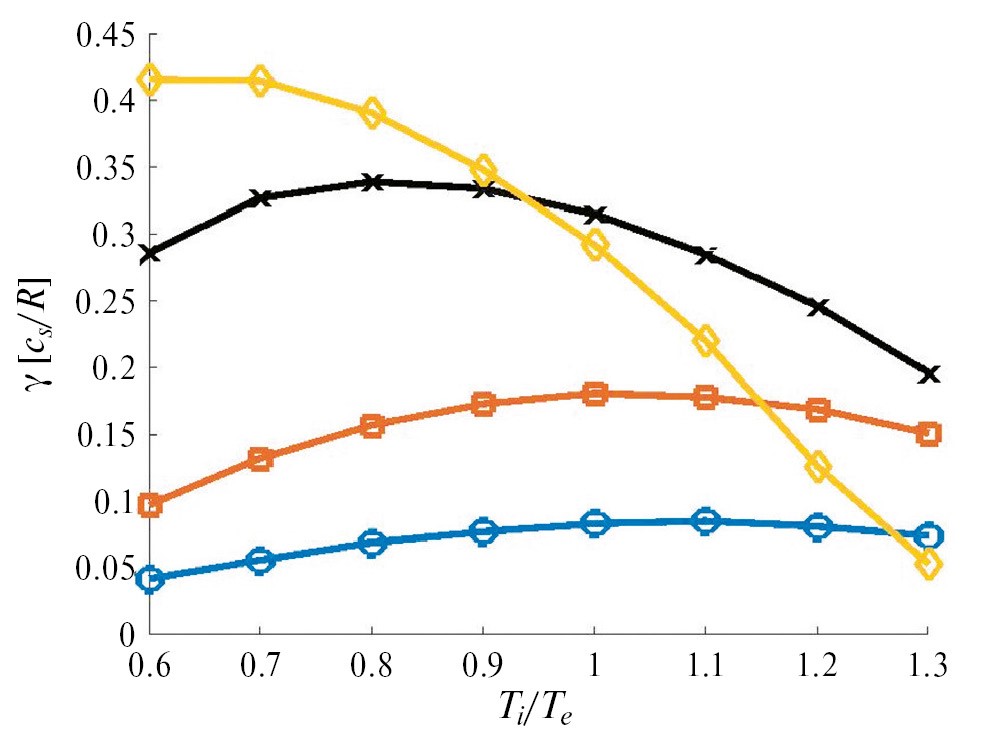 Рис. 12. Нормированные инкременты в зависимости от отношения температур T e / T i, рассчитанные с помощью кода GENE для разряда T -10 #71568 с моделью четырехкомпонентной плазмы при k y ρ s = 0.15 (кружки), k y ρ s = 0.20 (квадраты), k y ρ s = 0.30 (крестики), k y ρ s = 0.40 (ромбы).