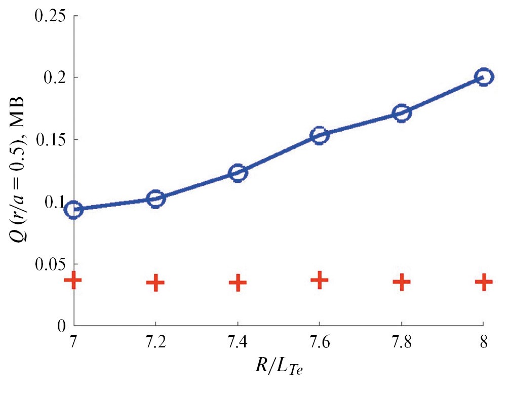 Рис. 14. Электронный (кружки) и ионный (крестики) тепловые потоки < Q > V ´ ‚ на среднем радиусе плазмы, r / a = 0.50, в зависимости от нормированного градиента электронной температуры R / L Te, рассчитанные с помощью кода GENE для двухкомпонентной плазмы разряда T 10#71568 в нелинейном приближении при R / L Ti = 6.4, R / L ne = R / L ni = 4.5.