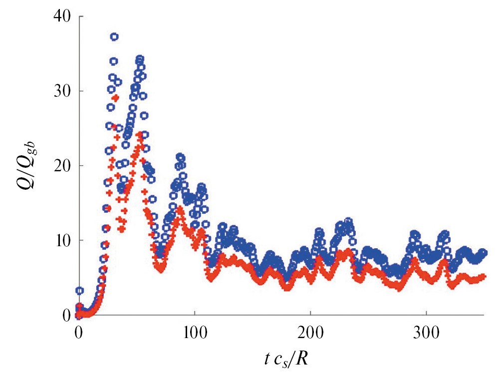 Характерная нелинейная эволюция нормированных тепловых потоков электронов (кружки) и ионов (крестики) для разряда T10#71568, рассчитанная с помощью кода GENE c использованием двухкомпонентной модели, показана на рис. 15. Нормировка теплового потока c использованием обозначений кода GENE cref = (Tref/mref)0.5 , pref = nrefTref, ρ*ref = cref /Ωref / Lref равна Qgb = cref pref (ρ*ref)2 = 0.64 кВт/м2, входные градиенты –R/Ln = 4.5, R/LTi = 6.2, R/LTe = 7.2. В этом расчете используется пятимерная сетка Nx×Ny×Nz×Nv||×Nµ = 128×24×32×16×8, 128 процессоров в течение 20 часов, усредненное по времени решения для нормированных тепловых потоков ионов и электронов равны соответственно и электронов <Qi>/Qgb=5.5±0.2, <Qe>/Qgb = 20.2±1.