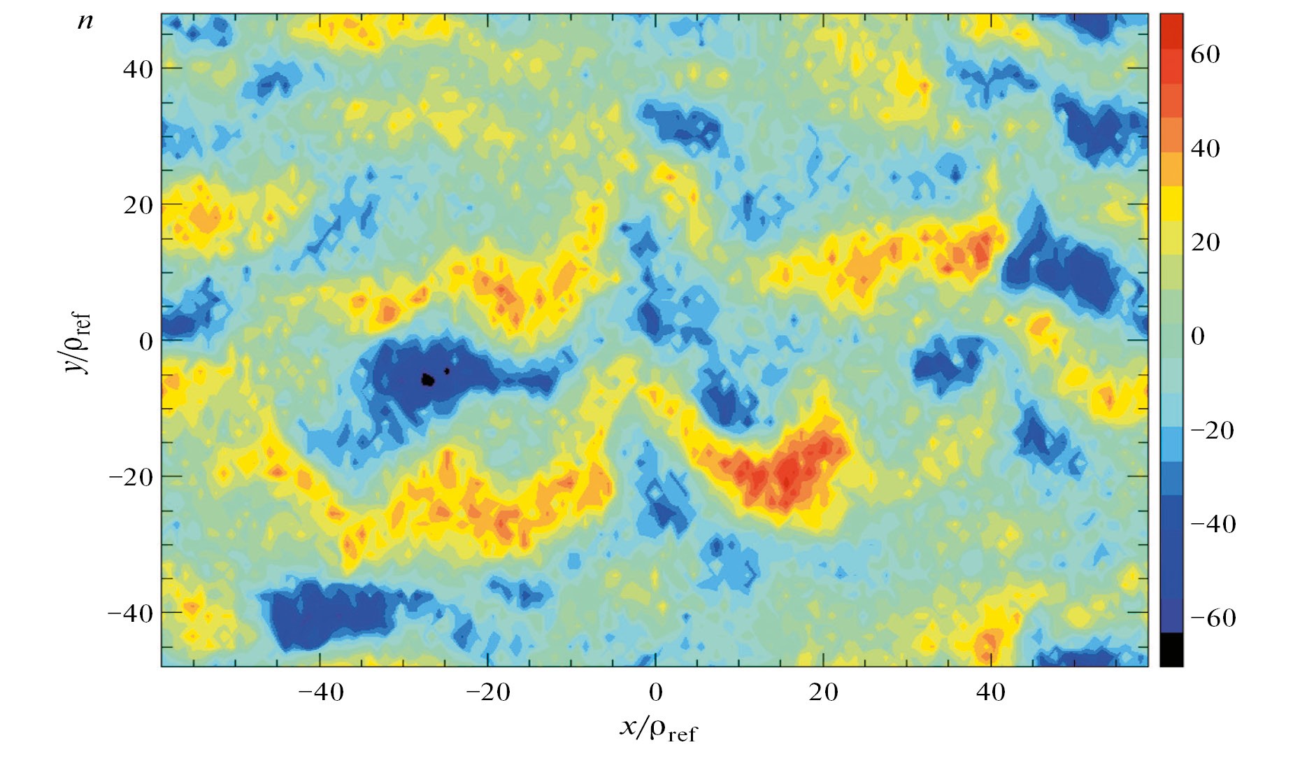 На рис. 17 в качестве примера показано распределение флуктуаций нормированной электронной плотности n/(n0ρs/R/1019) в плоскости, перпендикулярной силовой линии для параметров разряда Т-10#71568, вычисленное с помощью кода GENE. Размеры расчетной области составляли Lx × Ly = 117 ρs ×96 ρs, распределение представлено для конечного безразмерного момента времени расчета, равного tcs/R = 43, размер гирорадиуса равен ρs = 0.002 м. Цветовая шкала размеров флуктуаций показана на рис. 17 справа. Максимум флуктуаций наблюдается в этот момент времени в точке с координатами (x/ρs, y/ρs ) = (15, –20), минимум в точке с координатами (x/ρs, y/ρs ) = = (–25, –5). Детальное сравнение полученных численных пространственных и временных распределений флуктуаций плотности и мощности с результатами измерений флуктуаций на сторонах токамака Т-10 с сильным и слабым магнитными полями с помощью корреляционной рефлектометрии [30] требует большой дополнительной работы, которую планируется провести в ближайшее время.
