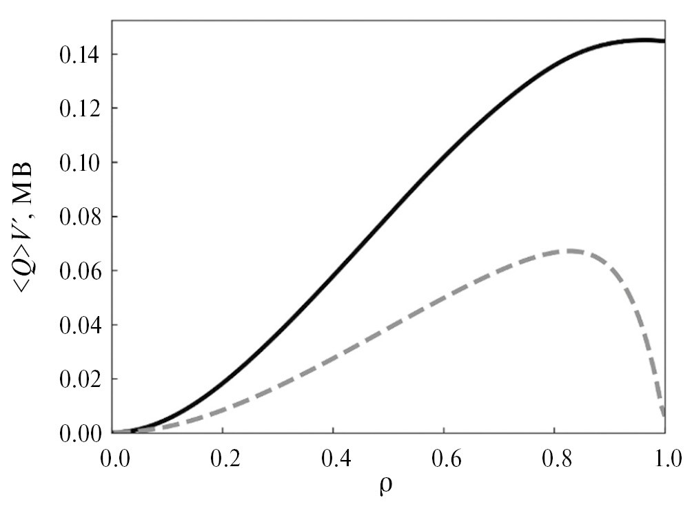 Тепловые потоки оценим из соотношений баланса для тепловой энергии по аналогии с выражениями (1), (2). В качестве граничных условий для тепловых потоков предполагалось отсутствие потоков на магнитную ось и непрерывность потока из центральной области плазмы в SOL, при этом предполагается, что теплоемкость SOL мала, а основным механизмом потерь в этой области является классическая продольная теплопроводность . Как показано в [33], такие граничные условия хорошо описывают зависимость времени удержания энергии от вводимой мощности, представленную в скейлинге ITER-98(y, 2). Зависимости <Qe>V′ и <Qi>V′ для Zeff = 1.7 на квазистационарной стадии расчета от радиуса приведены на рис. 18.