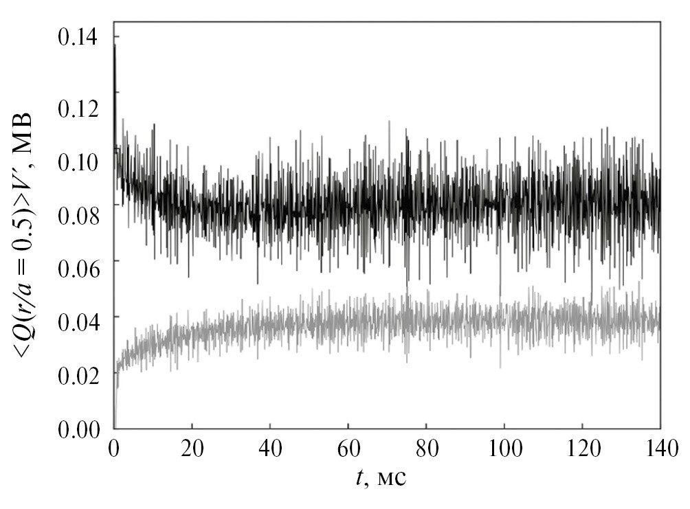 На рис. 19 приведены эволюции тепловых потоков ионов и электронов на середине радиуса во времени, полученные в результате моделирования с помощью кода CONTRA-T для Zeff = 1.7. Первые 20мс происходит релаксация профилей и насыщение турбулентных флуктуаций, при этом часть энергии переходит из тепловой в кинетическую энергию флуктуаций. Затем система переходит в квазистационарное состояние и потоки колеблются около средних значений. Тепловой поток в электронах составляет 80 кВт, в ионах 40 кВт, что хорошо согласуется с результатами моделирования кодом ASTRA.