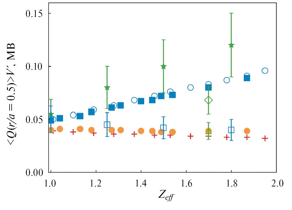 Зависимости тепловых потоков от эффективного заряда плазмы Zeff для двухкомпонентной модели плазмы разряда T10#71568 показаны на рис. 20. Получено хорошее соответствие (с учетом ошибок измерений и точности гирокинетических расчетов) между результатами кода ASTRA, описанными в разд. 3, и нелинейными гирокинетическими расчетами кода GENE. Значения ионного теплового потока, найденные с помощью кода ASTRA (крестики), хорошо совпадают с результатами расчетов кода GENE (квадраты). Ионный тепловой поток слабо зависит от эффективного заряда и приближенно равен <Qi>V´ = 40–50 кВт. Электронный тепловой поток имеет заметную линейную зависимость, полученную как в аналитических оценках (раздел 3), так и численно с помощью кодов ASTRA и GENE. С учетом примесей ионов углерода и кислорода, при эффективном заряде плазмы Zeff = 1.80 в разряде T10#71568, коды ASTRA и GENE дают близкие друг к другу результаты электронного теплового потока, равного на среднем радиусе r/a = 0.5, <Qe>V´ 100 кВт в пределах ошибки 20%.