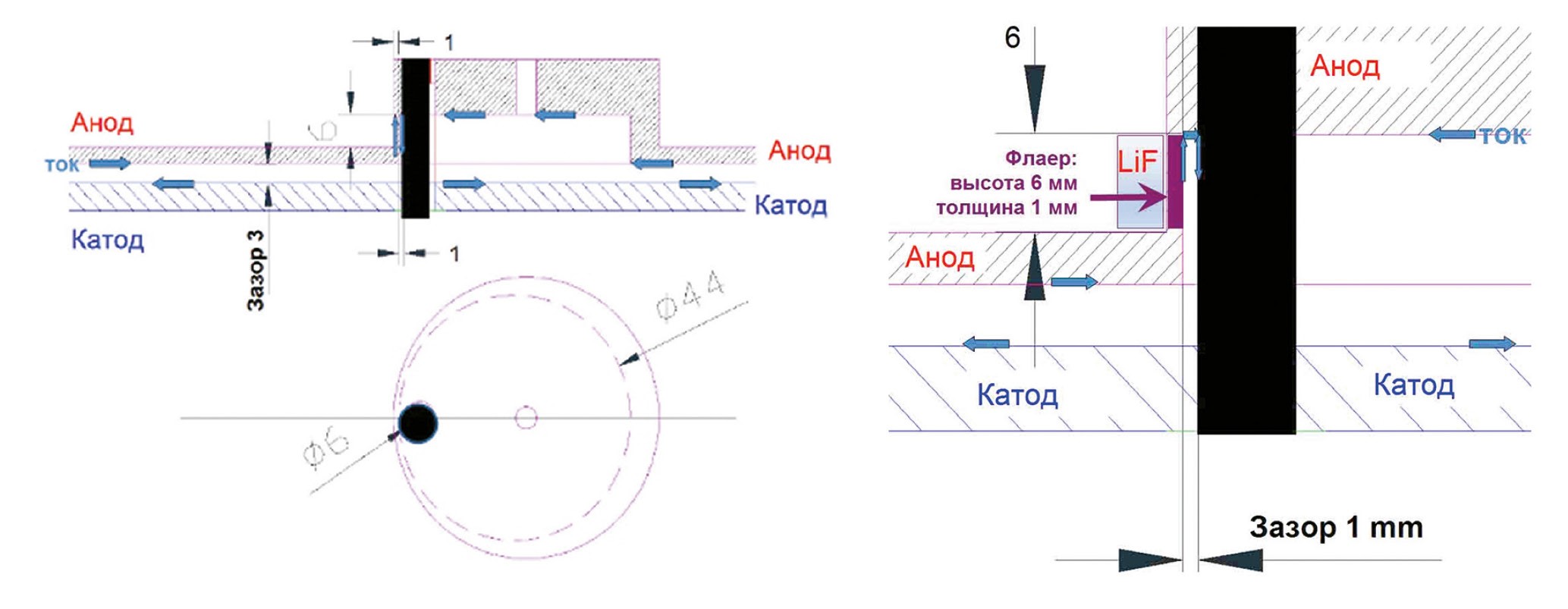 Концентратор тока располагался в вакуумной камере установки “Ангара- 5-1” при давлении 10 –5 Торр. Один из вариантов схемы центральной части концентратора показан на рис. 1. Внутренняя часть анода имела анодную полость диаметром 44 мм. Анод и катод соединены стержнем диаметром 6 мм. Благодаря асимметричному расположению стержня внутри анодной цилиндрической полости диаметром 44 мм магнитное поле в анодной полости концентрируется между стержнем и ближайшей к нему частью анода. Вертикальный участок анода с изображенным на рис. 1 размером 6 мм является ударником. Назовем поверхность ударника, ближайшую к стержню, – фронтальной, а противоположную поверхность ударника, – тыльной. Тыльная поверхность имела радиус кривизны 25, 5 мм. Толщина ударника (т.е. расстояние между фронтальной и тыльной поверхностями) в исходном состоянии около 1 мм. В ряде экспериментов к тыльной поверхности ударника был прикреплен кристалл LiF (см. правую часть рис. 1) толщиной 3 мм, в этом случае т ыльная поверхность ударника была плоской. В зазоре величиной 1 мм между стержнем и смежным участком анода создается сильное магнитное поле, масштаба 5 МГс. Под действием такого поля этот участок ускоряется наружу от анодной полости (справа налево). Исходя из постановки эксперимента, можно оценить ширину разгоняемого ударника как 5–10 мм, хотя экспериментально она не была измерена.