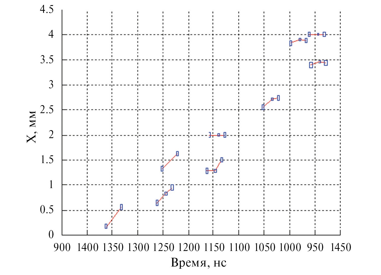 Рис. 3. Смещение Х в вакуум (без LiF) тыльной поверхности ударника в разные моменты времени по результатам лазерного зондирования. По вертикали – смещение тыльной поверхности ударника, по горизонтали – момент времени зондирования. Результаты, полученные в одном выстреле, соединены отрезками. Размеры прямоугольников соответствуют ошибкам.