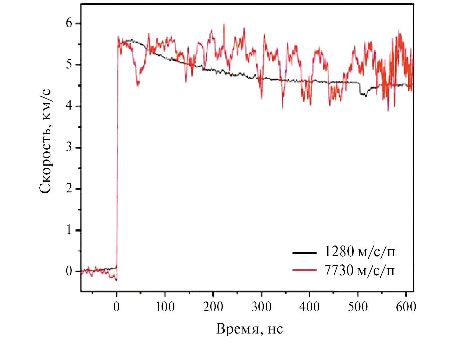 Для начала сопоставим результаты измерения скорости разными методиками: по лазерной теневой фотографии (см. рис. 3) и по интерферометрическим измерениям (см. рис. 4). Результат измерения скорости некоторой точки тыльной поверхности ударника с помощью двух интерферометров составляет 5.5 км/с. Тут следует отметить, что это измерение позволяет регистрировать локальную скорость некоторой точки.