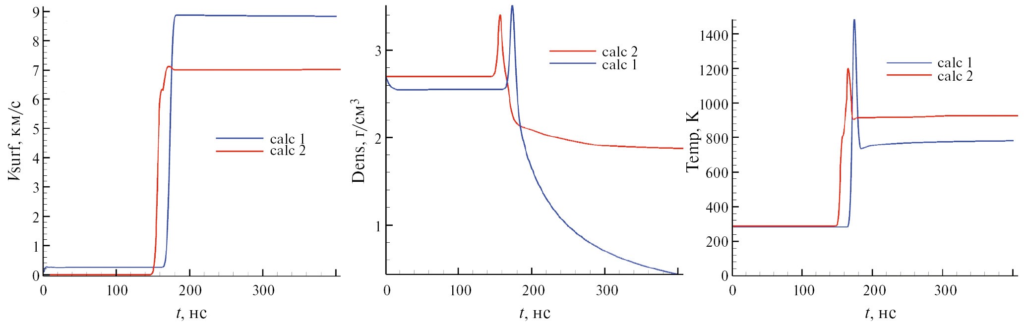 На рис. 10 для точки, расположенной на тыльной поверхности ударника на оси симметрии, показаны зависимости от времени скорости, плотности и температуры, полученные в разных расчетах. Из приведенных графиков видно, что после того, как волна возмущения достигает тыльной поверхности ударника, скорость и температура данного участка в обоих расчетах в дальнейшем практически не меняются. В расчете 1 скорость тыльной поверхности ударника составляет около 8,9 км/с, а температура – около 770 К. В расчете 2 скорость тыльной поверхности ударника составляет около 7 км/с, а температура – около 920 К. В то же время плотность данного участка ударника для различных моделей ведет себя по-разному: для модели 1 плотность быстро убывает (от пикового значения 3.5 г/см3 в момент времени 174 нс, до 0.43 г/см3 в момент времени 400 нс); для модели 2 плотность уменьшается гораздо медленней (от пикового значения 3.4 г/см3 в момент времени 157 нс, до 1.9 г/см3 в момент времени 400 нс).