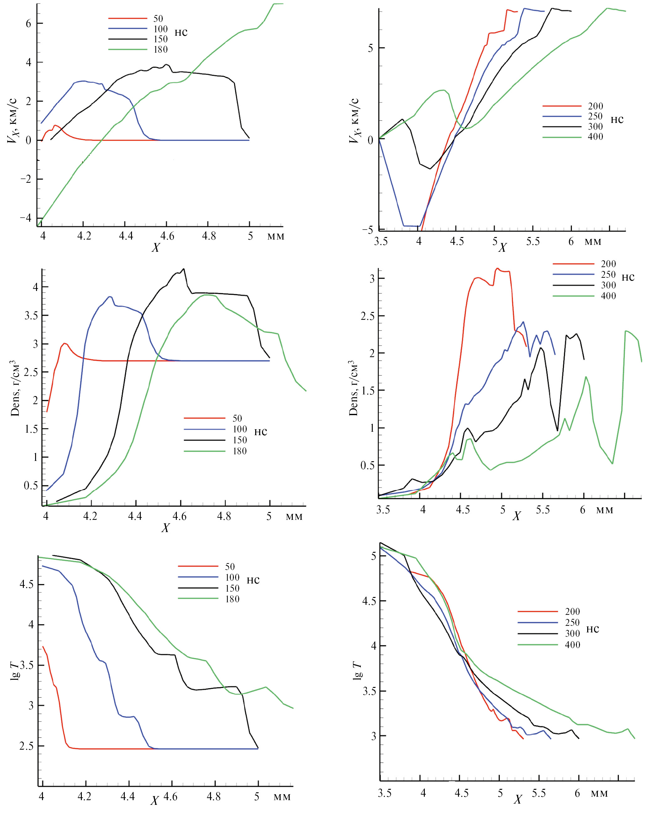 Рис. 12. Р аспределения скорости (Vх), плотност и (Dens), т емпературы (lg _ T) в различные моменты времени для расчета 2. Цифры в легендах – время в нс. По горизонтали – координата расчетной области, на оси ОХ в начальный момент времени ударник занимал область от 4 мм до 5 мм. Температура измеряется в Кельвинах.