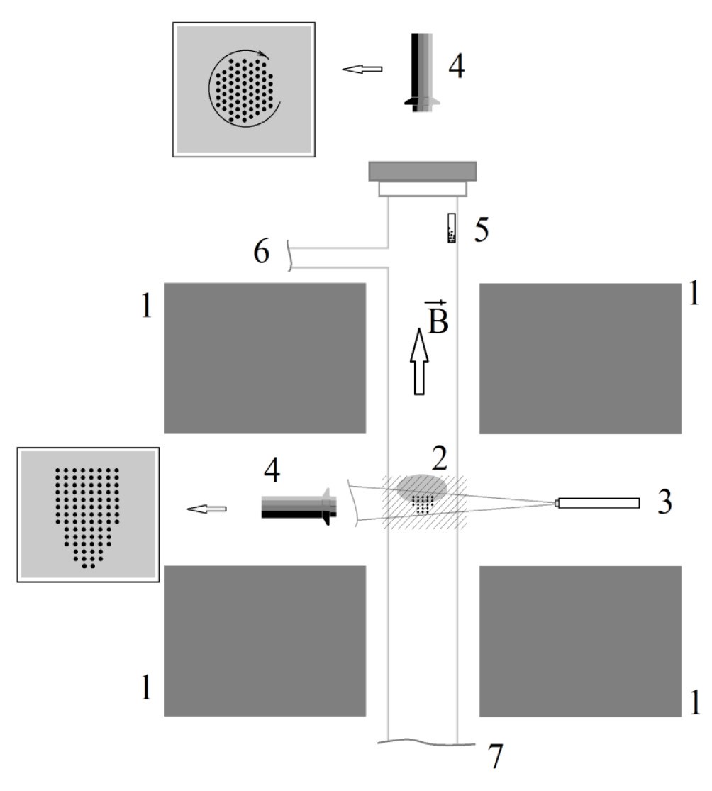 В итоге, на основе работ [8, 14, 17–19] сформировалось представление о возможности варьирования потока плазмы через изменение сорта газа, размера частиц, электрического поля, энергии электронов, плазменной плотности и магнитного поля. При этом азимутальный поток ионов, вызванный магнитным полем, будет «визуализироваться» наблюдением вращения пылевой структуры, работающей в качестве «пылевых зондов».