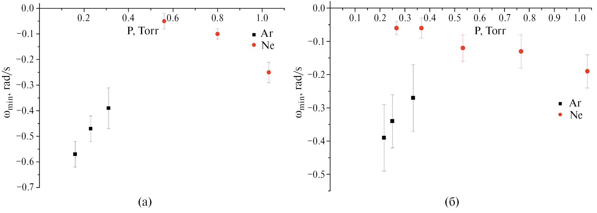 В первой серии экспериментов мы, согласно работе [17], выбрали условия, благоприятные для создания пылевой структуры в аргоне, (поскольку в неоне пылевая плазма существует в довольно широком диапазоне параметров): размер частиц 5 мкм, давление газа 0.33 Торр. Но в магнитном поле до 200 Гс скорость вращения пылевой структуры в аргоне оказалась больше чем в неоне, в зависимости от условий, до 10 раз. Это совершенно не соответствует предварительным оценкам потоков, как говорилось выше. Более того, в данной более широкой разрядной трубке и с частицами меньшей плотности, чем в [17], при одинаковом давлении пылевые структуры в магнитном поле не формировались. Диапазоны давления для аргона и неона, при которых существует устойчивое вращение пылевой плазмы в магнитном поле, видны на рис. 2а. Если экстраполировать указанные там зависимости к среднему давлению около 0.5 Торр, то экспериментально определенное отношение угловых скоростей в неоне и аргоне составило ω Ne / ω Ar = 0.1, в то время как оценки показывают величины в 20 раз больше (см. далее формулу (1)).