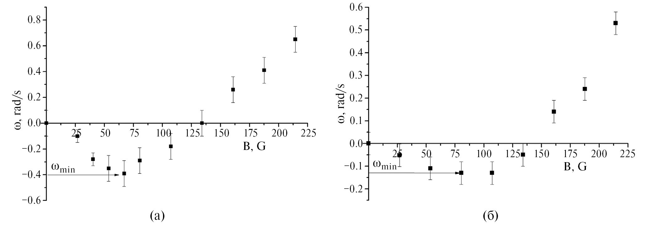 Рис. 3. Зависимость угловой скорости вращения пылевой структуры от величины магнитной индукции. Условия: а) газ Ar, P = 0.22 Торр, размер частиц – 4 мкм; б) газ Ne, P = 0.76 Торр, размер частиц – 4 мкм.