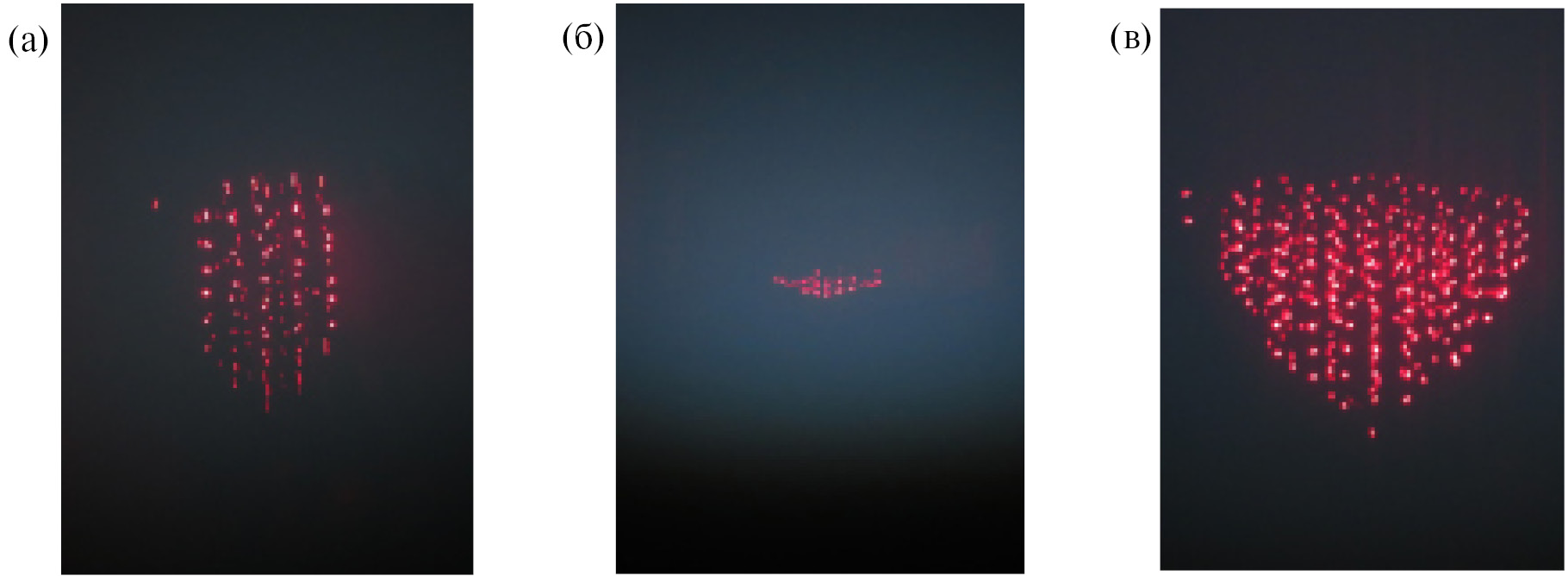 Этот несколько парадоксальный результат не соответствует представлению о потоках, идущих через пылевую структуру, как говорилось выше. Анализируя проблему, мы связали данное наблюдение с различным продольным размером пылевой структуры. Следуя предложенным в [23] подходу и терминологии для ВЧИ-разряда, можно сказать, что в условиях разряда в неоне Ne при давлении 0.33 Торр пылевая структура оказалась «насыщенной» и максимальное количество частиц, которые могут левитировать оказалось ограниченным. Для используемых частиц в данных условиях в пылевой ловушке не существует свободных вакансий: новые частицы при инжекции либо не захватываются, либо вытесняют из структуры другие частицы, занимая их место. Можно сказать, что проблема заключается в неоптимальных условиях разряда, а не в «деградации» частиц во времени, как, например, наблюдалось в работе [24]. Если выбранные для аргона условия оказались оптимальными для работы в магнитном поле, то в используемой относительно широкой разрядной трубке с частицами малой плотности сформированные структуры в неоне оказались продольно не протяженными. Вид сбоку структуры в аргоне в магнитном поле демонстрируется на рис. 4а. В неоне же при давлении 0.33 Торр (рис. 4б) наглядно демонстрирует отличие структуры по объему (по длине структуры). Представленное фото соответствует эксперименту, который попал на область оптимальных параметров для создания большой пылевой структуры в аргоне. В неоне же оптимальными условиями для существования объемной пылевой структуры из частиц 4 мкм являются давления от 0.5 до 1.0 Торр. Рисунок 4в демонстрирует объемную пылевую структуру в Ne при давлении 0.76 Торр. При увеличении давления газа неона до 1.0 Торр, пылевая структура из тех же частиц 4 мкм увеличивает продольный размер. Полученная в эксперименте скорость в Ne (при том же токе разряда и давлении 0.76 Торр) в магнитном поле дает иное соотношение скоростей вращения ω Ne / ω Ar =0.5. Это изменение в оценке связано, прежде всего, с разностью концентрации ионов, скорости их потока, замагниченности и трения газа.
