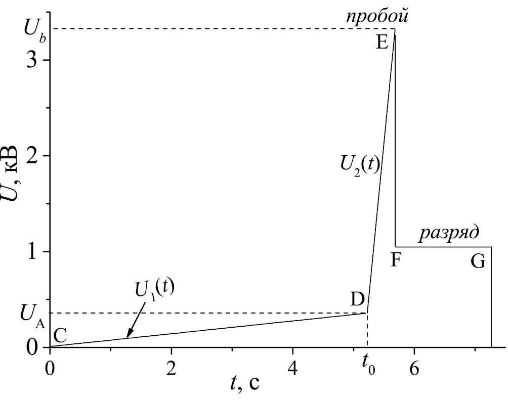 Если пробой, на фоне медленного роста анодного напряжения, в точке, где U = U A, инициируется скачком напряжения, как это описано в начале раздела (рис. 2, 3), то из (1) и (3) получается