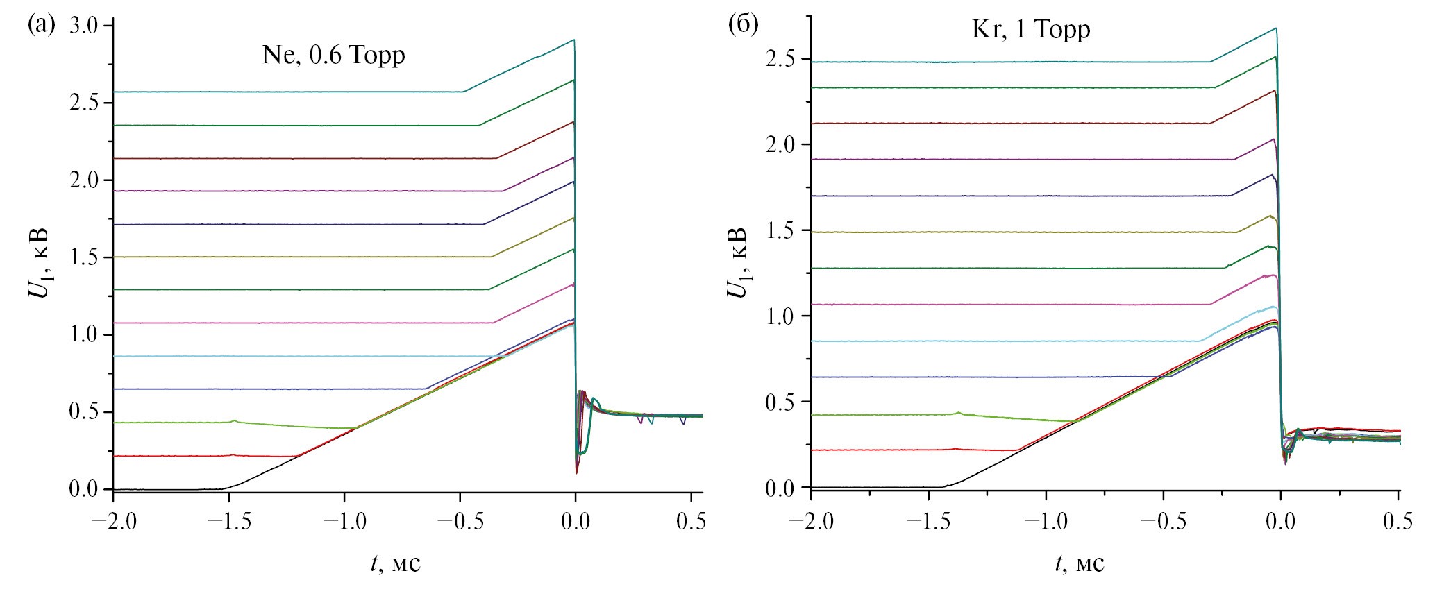 На рис. 3 представлены осциллограммы анодного напряжения для двух газов – неона и криптона. Регистрировался короткий промежуток времени вблизи момента пробоя. На таком промежутке отрезок осциллограммы, отвечающий наклонной прямой CD рисунка 2, выглядит горизонтальным. Самая нижняя траектория соответствует случаю, когда напряжени е U 1 (t) отсутствовало, то есть при U А = 0. Остальные осциллограммы отвечают разной задержке t 0 импульса U 2 относительно начала роста U 1 (t), о т 5 до 60 с, что соответствует значениям U А ≈ 200 ÷ ÷ 2500 В. Видно, что потенциал U 1 влияет на напряжение пробоя, но только если U А превышает некоторое критическое значение ; последнее близко к потенциалу пробоя без освещения U b 0 [4]. При меньших U А наличие потенциала U 1 не меняет потенциал пробоя или меняет незначительно.