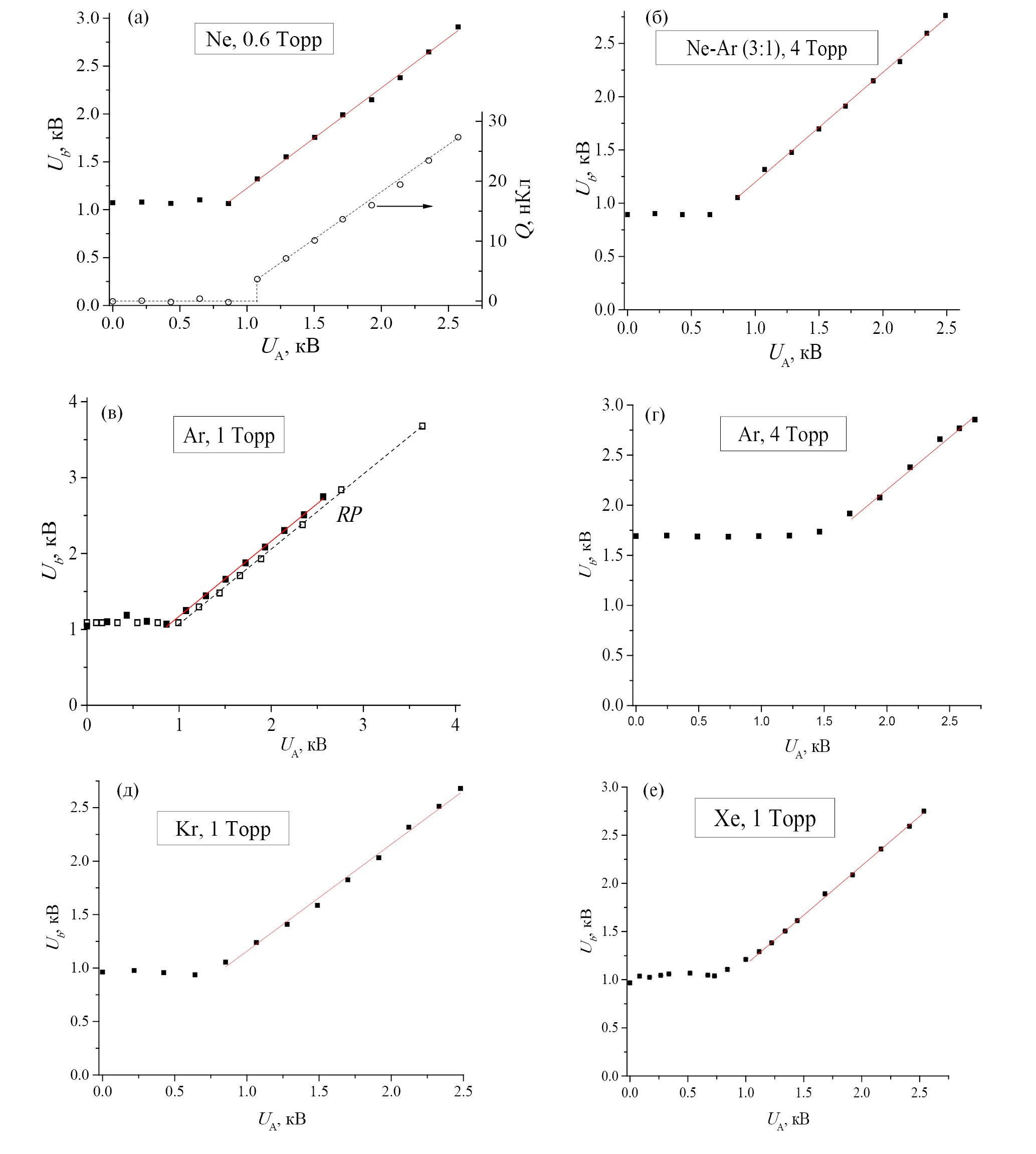 Рис. 4. Зависимость напряжения пробоя от потенциала анода в различных газах. На рис. 4а приведены также значения поверхностного заряда стенки, на рис. 4в RP – пробой прямоугольным импульсом. Скорость роста анодного напряжения dU 1 / dt = 37–48 В/с, освещение люминесцентными лампами.