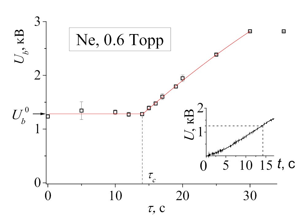 Проведенные исследования уточняют описанный выше механизм. Выяснено, что зарядка стенки трубки начинается не от момента начала роста анодного напряжения, а только когда оно приближается к напряжению пробоя, измеренному в отсутствие освещения (U b 0). При этом внутренняя поверхность стенки за время, не превышающее 0.1 с, приобретает потенциал 130–200 В. В результате в момент, когда потенциал анода становится равным U b 0, пробой освещаемой трубки не происходит. При дальнейшем росте напряжения разность потенциалов между анодом и стенкой сохраняется вплоть до достижения анодом потенциала пробоя, существенно превышающего U b 0. Вывод о том, что зарядка стенки трубки начинается только когда потенциал анода приближается к U b 0, подтверждается экспериментами с импульсным освещением трубки, а также наблюдением движения волны ионизации, инициируемой дополнительным импульсом, подаваемым на катод до пробоя при заданном анодном напряжении.
