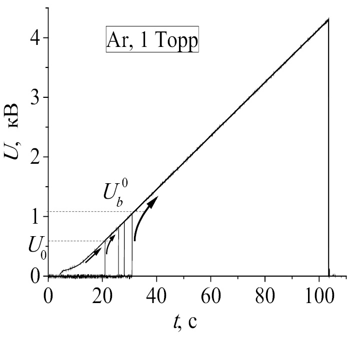 В предыдущих работах авторов [3, 4] было обнаружено, что при достаточно медленном росте потенциала анода разрядной трубки (~10–100 В/с) напряжение пробоя U b в инертных газах может существенно возрасти, если прианодная область трубки освещается излучением видимого диапазона.