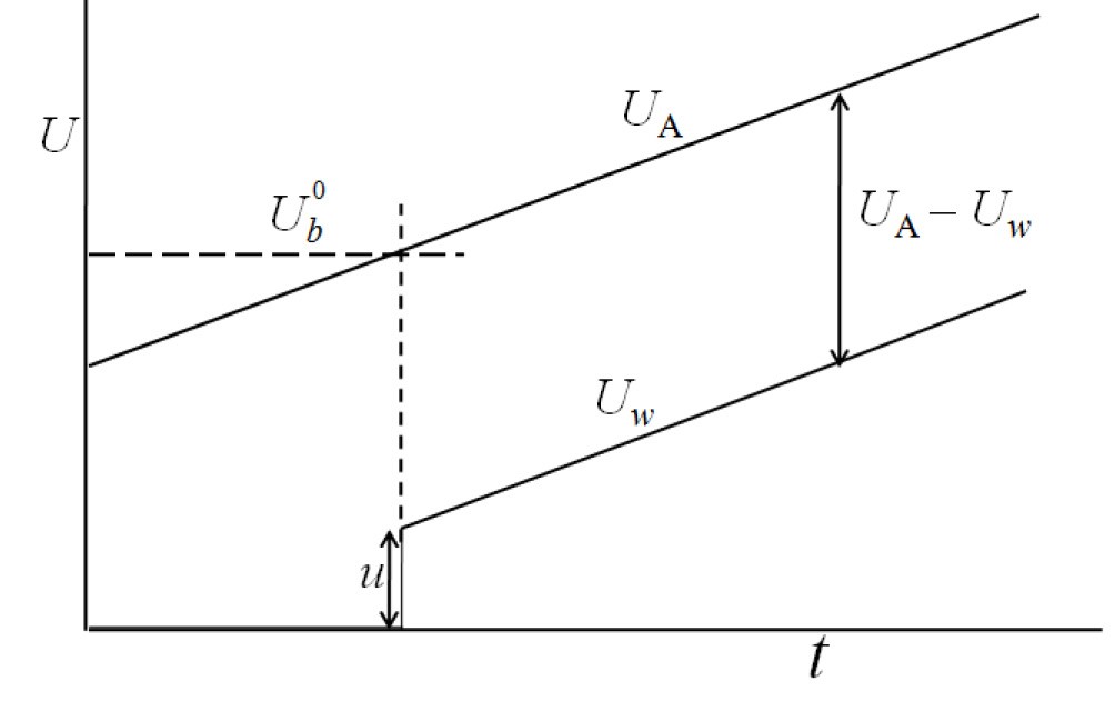 Рассмотрим подробнее случай, когда U 0 < U b 0. Можно предложить следующий сценарий происходящего в этом случае. Поскольку время зарядки стенки не превышает 0.1 с, в масштабе времени рис. 7 она происходит мгновенно, и в точке, где U = U b 0, потенциал стенки U w меняется скачком на некоторую величину u (рис. 9). Так как стенка становится заряженной, пробой в этот момент не происходит, потенциал U продолжает расти, что приводит к дальнейшему заряду стенки, поддерживающему постоянную разность между ее потенциалом и потенциалом анода: