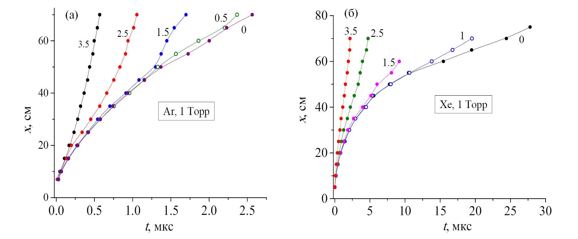 Освещение разрядной трубки излучением видимого диапазона может заметно влиять на характеристики пробоя в трубке – пробивное напряжение U b и время запаздывания пробоя (см. [1] и приведенные там ссылки). В недавних работах [2–4] обнаружено, что, в зависимости от скорости роста приложенного напряжения dU / dt, потенциал U b при освещении может меняться: как уменьшаться, так и увеличиваться. Первое реализуется при большой скорости роста напряжения, второе – при малой (рис. 1). Согласно [3, 4], исходной причиной в обоих случаях является вызванная освещением фотоэмиссия слабосвязанных электронов, адсорбированных на внутренней поверхности разрядной трубки. Эти электроны попадают под действие поля, существующего между стенкой и анодом. При быстром росте приложенного напряжения они с большой вероятностью оказываются в фазе сильного поля, что приводит к их размножению и формированию электронной лавины, инициирующей волну ионизации (ВИ) и последующее развитие пробоя. В результате уменьшается время запаздывания пробоя, что в условиях фронта импульса конечной длительности снижает пробивной потенциал. При медленном росте напряжения десорбированные электроны бóльшую часть времени находятся в фазе слабого поля, в котором ионизация невозможна. Однако, двигаясь в этом поле, они создают ток, заряжающий стенку области вблизи анода. Разность потенциалов между анодом и стенкой уменьшается, в результате чего для создания ВИ и пробоя требуется повышение анодного напряжения. В работе [3] это наблюдается в ксеноне, а в [4] еще и в неоне, аргоне и криптоне при низких давлениях (~1 Торр) и dU / dt ~ 10–100 В/с. Результаты этих работ привели к заключению, что напряжение пробоя при освещении трубки U b связано с напряжением пробоя без освещения U b 0 соотношением